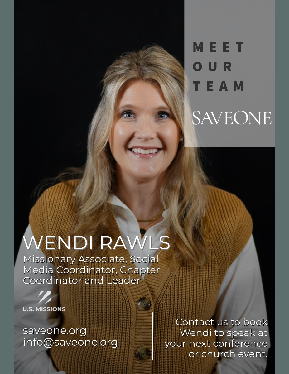 Wendi Rawls joined the SaveOne team in July 2022 as a Chapter Coordinator and is currently itinerating as an AGUS Missionary Associate in order to transition over to a full-time role with SaveOne. Wendi had the amazing privilege of meeting Jack & Sheila Harper in 2021 when they spoke at a local conference. As she listened to their heart's desire of helping those who are abortion wounded, it started to become a passion in her own heart. Wendi knew that even though she had asked the Lord for forgiveness for having an abortion in 2007, that she had never really forgiven herself.