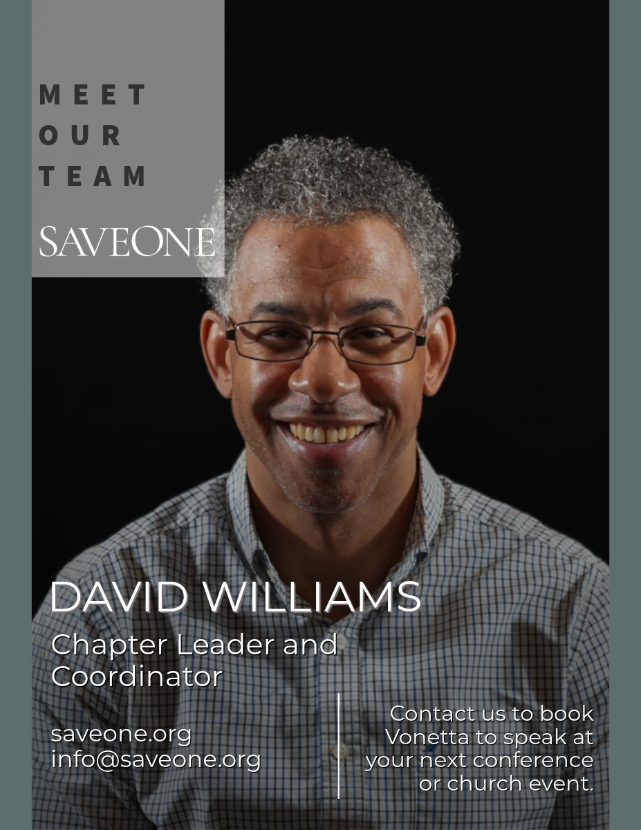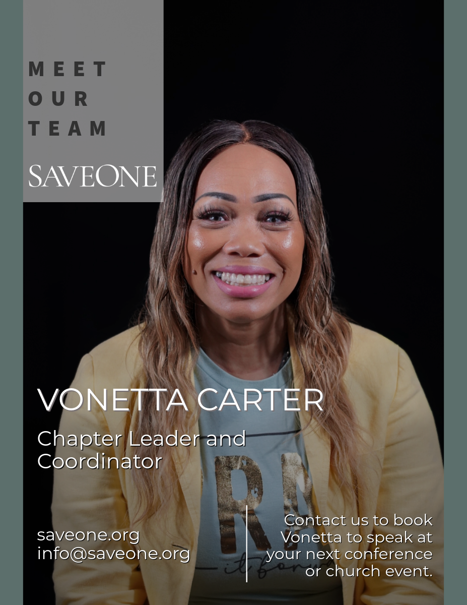 A chapter coordinator for Save One, Vonetta meets the abortion-wounded, with an open heart and extended hand in their brokenness. With empathy from her own abortion loss, Vonetta shares her story with the liberating truth of God's word setting captives free.Vonetta's candid transparency and journey paint a picture of how God begins work in each of us that he promises to bring to completion. She is wife to Veronne, and has a beautifully blended family of five young adults, as well as three middle school girls. Her three precious grandchildren are a reflection to her of God’s redeeming love.