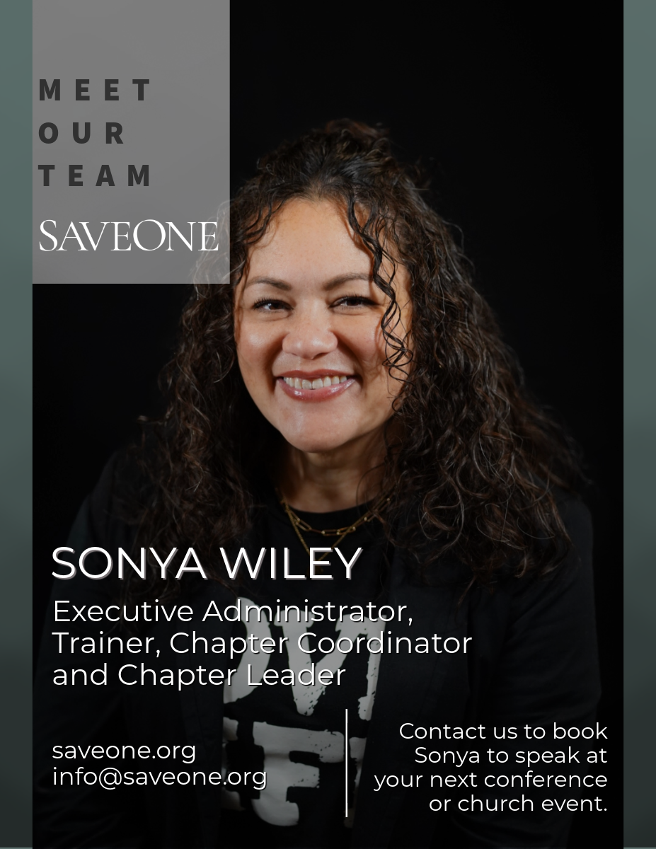 Sonya Wiley has been part of SaveOne since 2017, first serving as a chapter leader and later as a volunteer Chapter Coordinator. Today, she continues to walk in her calling as the full-time executive assistant to Jack and Sheila Harper, as well as serving as a coordinator, a trainer, and member of the SaveOne speaking team.